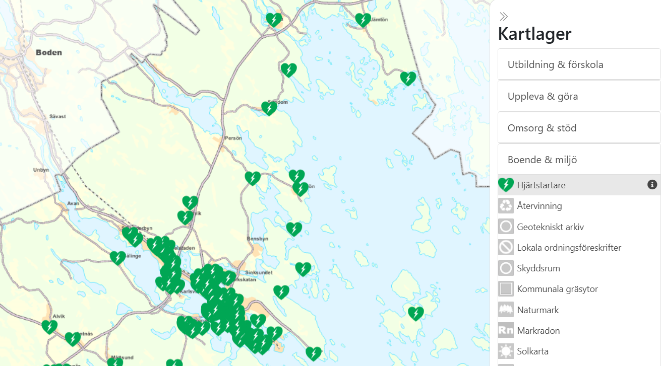För att öka tillgängligheten och tryggheten har Luleå kommun nu publicerat information om alla registrerade hjärtstartare i kommunen i ett eget kartlager på Kommunkartan.