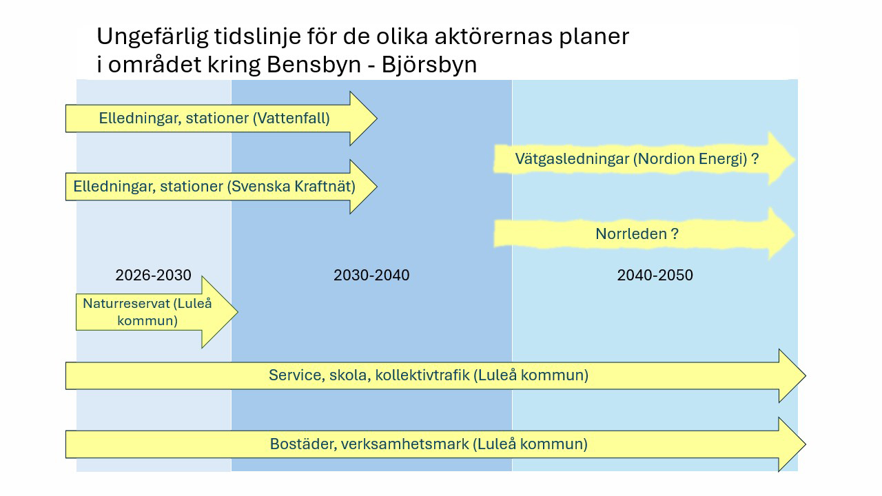 Ungefärlig tidslinje för de olika aktörernas projekt i området kring Bensbyn - Björsbyn. Det som ligger närmast i tiden finns till vänster i bilden, till exempel bildande av naturreservatet Hällmyran planeras vara klart innan 2030. Kraftledningar planeras att påbörjas innan 2030 och förväntas vara färdiga någon gång runt 2035. Norrleden och vätgasledningar är projekt som inte är helt beslutade ännu så därför är deras pil lite luddig, de planeras inte starta förrän framåt 2040. Övrigt i området som till exempel offentlig service som skola, kollektivtrafik och mark för bostäder och verksamheter kommer utvecklas från och med nu och under cirka 25 år framåt.